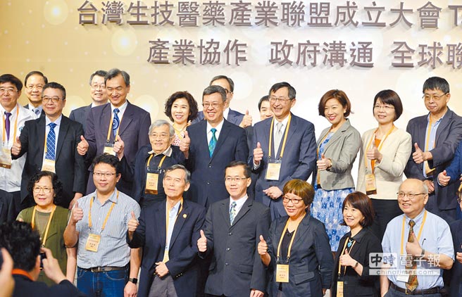 2017年臺(tái)灣生技醫(yī)藥產(chǎn)業(yè)聯(lián)盟成立大會(huì),臺(tái)灣地區(qū)副領(lǐng)導(dǎo)人陳建仁(中)應(yīng)邀出席致詞。(臺(tái)媒資料照片)