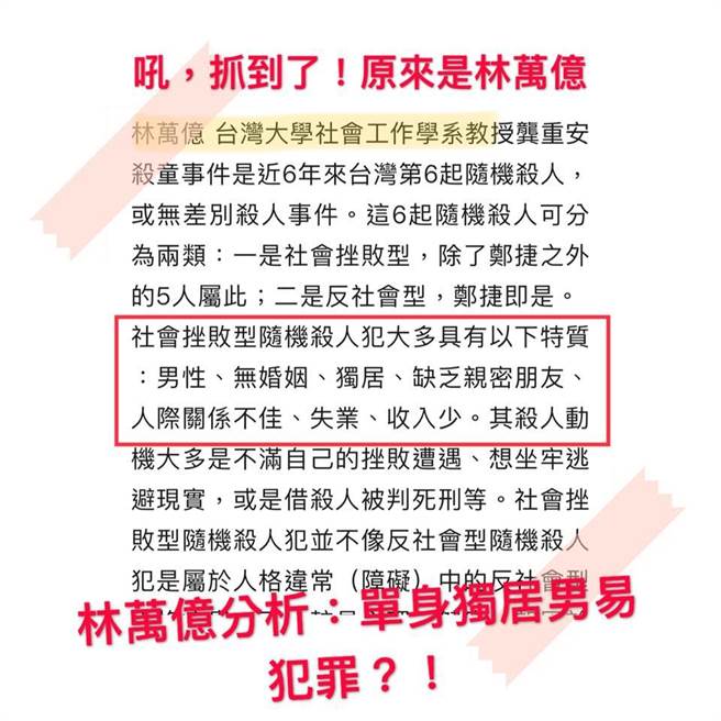 她很好奇,為什么這兩位對于隨機犯罪者的分析會如此相近?一定有所本,所以她找出這套“單身獨居男易犯罪”的高論,是由蔡英文的核心幕僚——“政務委員”林萬億所提出!現在“單身獨居男易犯罪”的看法,讓許多單身男生感覺不舒服;也引起李錫錕、溫朗東等多位時政評論人表達質疑。