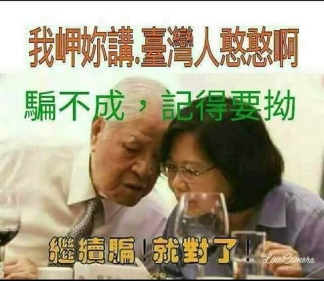 另有網友發出多張蔡英文照片回應,一張是蔡吃面包的,留言說,她正在吃;另外一張是李登輝與蔡英文耳語合照,上面寫著“我岬你講,臺灣人憨憨啊,騙不成,記得要拗,繼續騙,就對了”。(中國臺灣網 李寧)