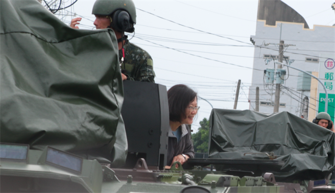 蔡英文搭云豹裝甲車進入尚在淹水的布袋鎮永安里勘災。