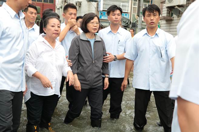蔡英文在災民要求下,下車“撩水”勘災。