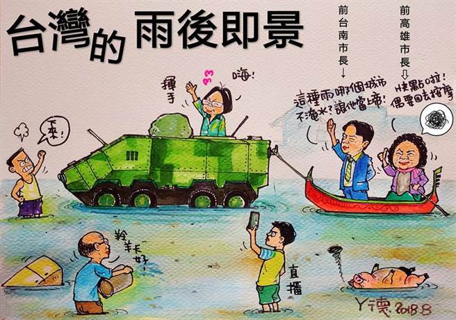 中國(guó)臺(tái)灣網(wǎng)8月28日訊 據(jù)臺(tái)灣“中時(shí)電子報(bào)”報(bào)道,823暴雨重?fù)裟吓_(tái)灣,多處水淹成災(zāi)引發(fā)民怨。臺(tái)灣地區(qū)領(lǐng)導(dǎo)人蔡英文、臺(tái)當(dāng)局“行政院長(zhǎng)”賴清德的勘災(zāi)行為,及“內(nèi)政部長(zhǎng)”徐國(guó)勇的發(fā)言引發(fā)許多爭(zhēng)議。對(duì)此,阿德漫畫在粉專上PO出諷刺漫畫創(chuàng)作,以蔡英文搭云豹裝甲車進(jìn)入水災(zāi)區(qū)勘災(zāi)為主題,還找來賴清德、陳菊當(dāng)配角暗諷時(shí)事。