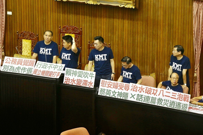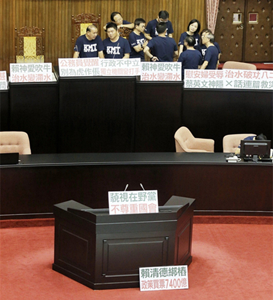 國民黨“立委”在現(xiàn)場擺滿抗議標(biāo)語,包含“公務(wù)員覺醒、別為虎作倀”“慰安婦受辱、蔡英文神隱”“賴神愛吹牛、治水變滯水”“行政不中立、獨(dú)立機(jī)關(guān)變打手”“賴清德綁樁、政策買票7400億”“假新聞?wù)妾?dú)裁、箝制新聞自由”;還在地面鋪上“東廠亂政、民主之恥”“促轉(zhuǎn)惡轉(zhuǎn)、賴揆道歉”大字。隨后一行人邊開會邊占領(lǐng)主席臺。