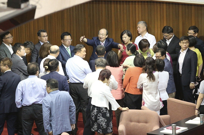 據(jù)報道,國民黨團(tuán)書記長曾銘宗一早6時就先到場坐在主臺上準(zhǔn)備,其余“藍(lán)委”接近8時陸續(xù)進(jìn)場在主席臺上開會,展開占領(lǐng)行動。