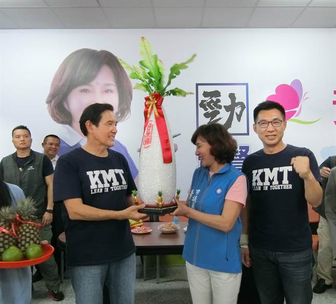 馬英九送上“菜頭”象征好彩頭,祝福臺中市議員黃馨慧高票當選。(圖片來源:臺灣“中時電子報”)