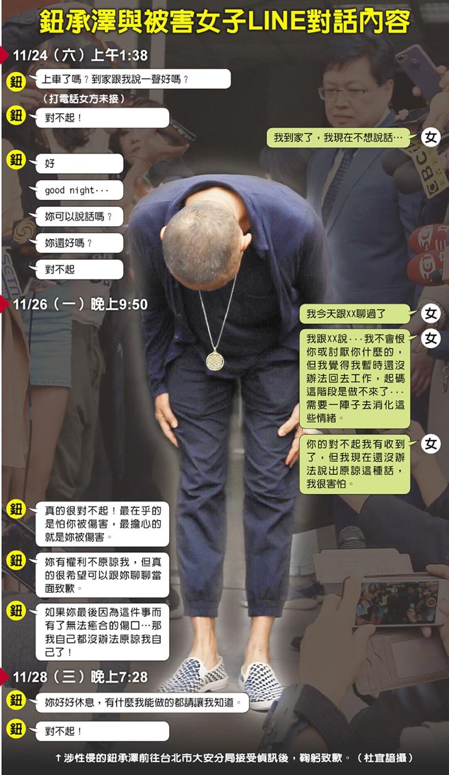 中國臺灣網12月8日訊  據臺灣《中國時報》報道,臺灣知名導演鈕承澤遭女劇組員工指控性侵,昨(7日)到警局應訊,外傳鈕稱與被害女子“互有好感”,企圖合理化兩人之間的親密關系,但隨即遭被害女子打臉,公布兩人在案發前后的LINE對話截圖,顯示兩人的確并不熟識,且案發后鈕不斷向她道歉,絕非你情我愿。