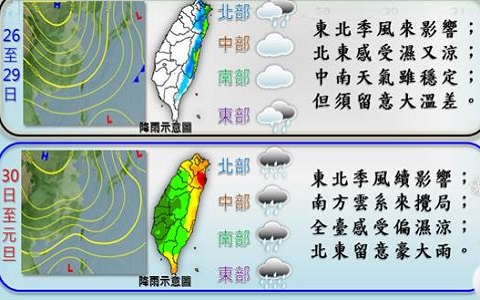 臺灣氣象部門官方臉書表示,26日起下半天將會開始受到東北季風影響,為時整整一周,冷空氣更可能達到冷氣團等級,中部以北低溫最低將下探到13度,南部與花東地區也不到20度。30日起除了原本的東北季風,南方云系也會前來攪局,全臺都處于濕冷狀態,北部東部地區會持續降雨,甚至出現局部性大雨,中南部也有短暫陣雨,整個跨年連假將與雨水度過。