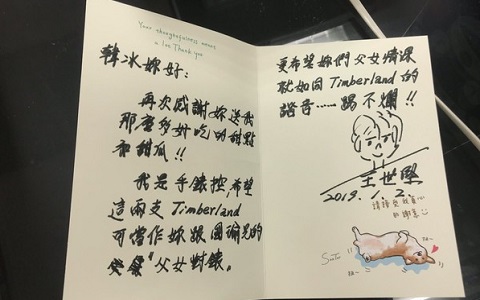 王世堅受訪“解密”說,元旦是他生日,竟收到韓冰寄的馬卡龍巧克力、哈密瓜,令他覺得很窩心,“我長這么大第一次吃馬卡龍”,剛好自己要換手表表帶,就順便買了同品牌2只表。王世堅還出示他畫給韓冰的卡片復印件,上頭寫著“韓冰妳好,感謝妳送我這么多好吃的甜點和甜瓜,我是手表控,希望這兩支Timberland可以當作你跟國瑜兄的父女對表,更希望你們父女情深,就如同諧音踢不爛。”