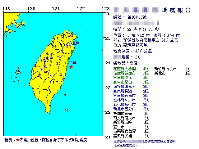 15日晚間10時(shí)8分7秒,花蓮附近外海發(fā)生里氏5.0地震,地震深度43.6公里。(圖片取自臺(tái)媒)