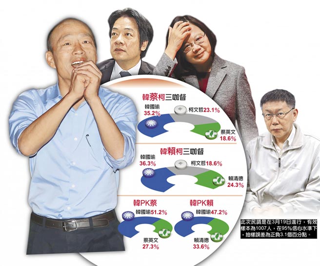 賴清德宣布競逐民進黨內提名后,旺旺中時針對各類可能賽局進行民調。綜觀數據發現,民進黨若派蔡英文上陣,在柯文哲參選的“三咖督”情況下,無論國民黨派朱立倫或韓國瑜,蔡的民調一律墊底。其中,在“蔡vs.韓vs.柯”的情況下,3人支持度依序為韓35.2%、柯23.1%、蔡18.6%。