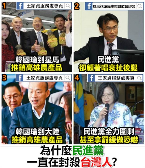 “鳳凰花護民主市政監督聯盟”在臉書指出,韓國瑜到新馬推銷高雄農產品,民進黨卻顧著唱衰扯后腿;韓國瑜到大陸推銷高雄農產品,民進黨全力圍剿甚至拿罰款做恐嚇,“為什么民進黨一直在封殺臺灣人?”