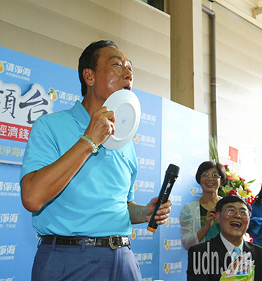 鴻海董事長郭臺銘(左)上午到桃園市參訪清凈海生技公司,試用清凈海的環保產品洗盤子,大贊清凈海對環境的用心,還用舌頭舔盤子為清潔劑安全掛保證。(圖片來源:臺灣《聯合報》)