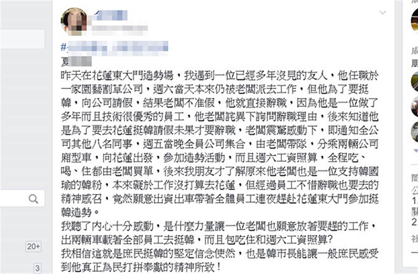網(wǎng)友在臉譜網(wǎng)(facebook)分享:“昨天在花蓮東大門造勢場,我遇到一位已經(jīng)多年沒見的友人,他任職于一家園藝割草公司,周六當(dāng)天本來仍被老板派去工作,但他為了要挺韓,向公司請假,結(jié)果老板不準(zhǔn)假,他就直接辭職。因為他是一位做了多年而且技術(shù)很優(yōu)秀的員工,他老板詫異下詢問辭職理由,后來知道他是為了要去花蓮?fù)n請假未果才要辭職,老板震驚感動下,即通知全公司其他八名同事,周五當(dāng)晚全員公司集合,由老板帶隊,分乘兩輛公司廂型車,向花蓮出發(fā),參加造勢活動,而且周六工資照算,全程吃、喝、住都由老板買單。后來我朋友才了解原來他老板也是一位支持韓國瑜的韓粉,本來礙于工作沒打算去花蓮,但經(jīng)過員工不惜辭職也要去的精神感召,竟然愿意出資出車帶著全體員工連夜趕赴花蓮東大門參加挺韓造勢。”