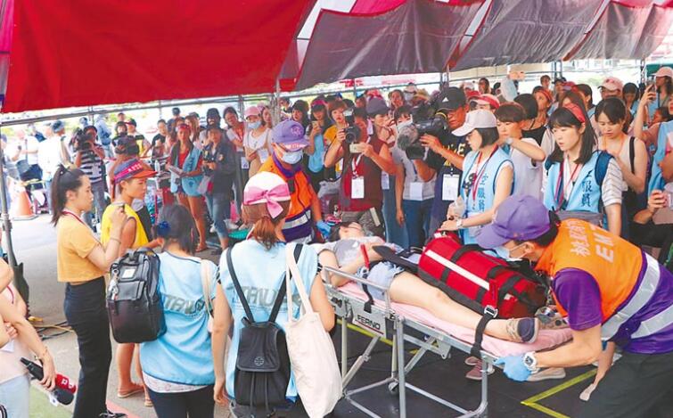 長榮罷工現場一名空服員身體不適昏倒(圖片來源:臺灣《中國時報》)