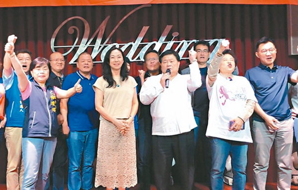 挺韓的鎮(zhèn)瀾宮董事長(zhǎng)顏清標(biāo)(右三)向郭臺(tái)銘、王金平喊話。(圖片來源:臺(tái)灣《聯(lián)合報(bào)》)