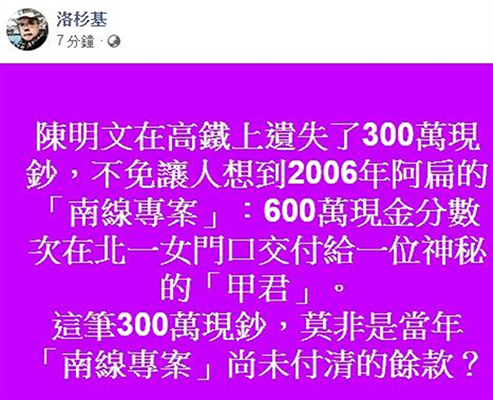 洛杉基表示,陳明文在高鐵上遺失了300萬現鈔,不免讓人想到2006年陳水扁的“南線專案”。他解釋道,2006年600萬現金分數次在臺灣北一女中門口交付給一位神秘的“甲君”,這筆300萬現鈔莫非是當年“南線專案”尚未付清的余款?
