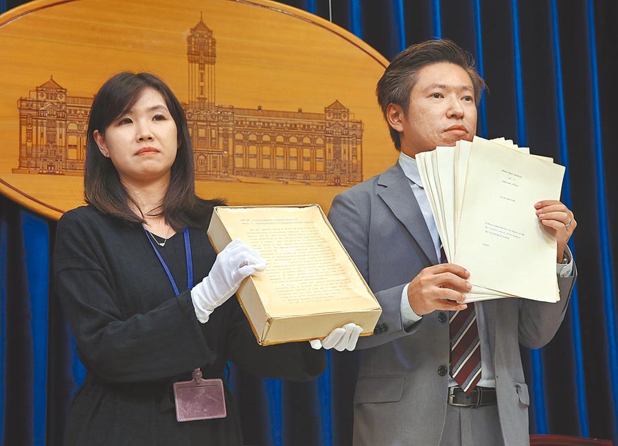 蔡英文辦公室發言人張惇涵(右)亮出蔡英文在倫敦大學博士論文原稿。(圖片來源:臺灣“中時電子報”)
