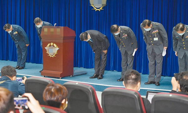 在輿論壓力下,民進黨當局防務主管部門負責人嚴德發(右四)21日晚開記者會向社會鞠躬道歉。(圖片來源:臺灣《中國時報》)