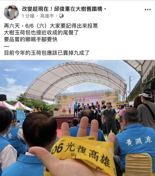 2020高雄鳳荔季開幕典禮30日上午舉行,韓國瑜與多位局處首長、議員均出席這場盛事,民進黨議員邱俊憲也參加了這場活動。儀式進行到請在場來賓上臺時,包括司儀、高雄市新聞局長鄭照新皆上前邀請邱俊憲一同上臺,但他當場婉拒,仍然坐在臺下貴賓區。不料,沒多久邱俊憲就在臉譜網發文,寫著“再六天,6/6(六)大家要記得出來投票”,并附上一張在臺下手拿“光復高雄”黃絲帶、臺上韓國瑜正在頒獎的照片。