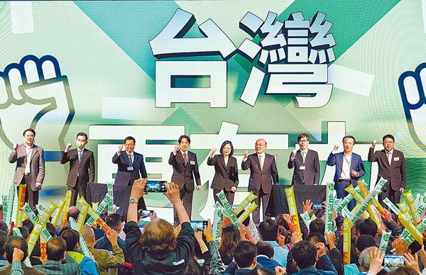 民進黨14日舉行黨員代表大會,蔡英文(中)率眾呼吁四項“公投”“四個不同意”立場。(圖片來源:臺灣“中時新聞網(wǎng)”)