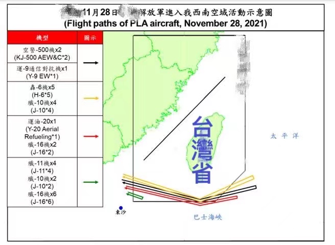 據(jù)臺軍方公布的消息,解放軍當(dāng)日共派出27架次軍機在日間進(jìn)入臺灣島空域,包括2架次空警-500、1架次運-9通信對抗機、5架次轟-6、1架次運-20、6架次殲-10、4架次殲-11、8架次殲-16。臺軍公開的解放軍活動示意圖顯示,解放軍部分軍機從臺島西南與東沙島東北方向之間的空域,進(jìn)入臺方劃設(shè)的所謂“防空識別區(qū)”,并經(jīng)臺島南部巴士海峽飛至臺島東南方向,又循相同航跡返回。臺軍則稱派出空中兵力陪飛,進(jìn)行所謂“廣播驅(qū)離”,防空導(dǎo)彈“追監(jiān)”。