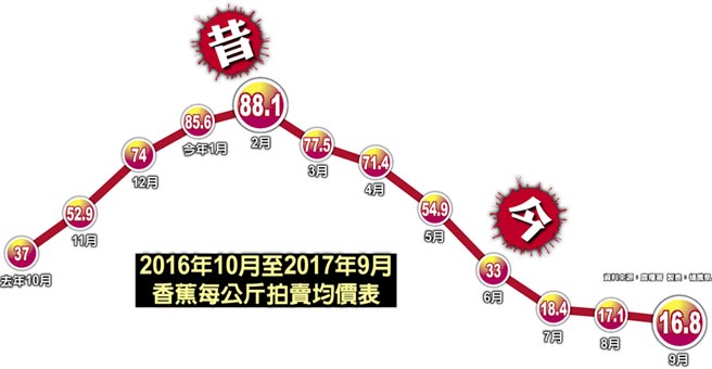 2016年10月至2017年9月臺(tái)灣香蕉每公斤拍賣均價(jià)表(單位:新臺(tái)幣;圖片來(lái)源:臺(tái)灣《聯(lián)合報(bào)》)