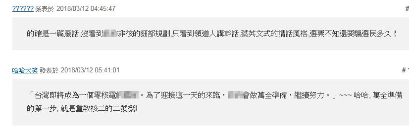 更有耿直的網友直接把矛頭對準蔡英文,“(廢核)還不如直接廢蔡英文比較快”、“老在空中畫餅,把臺灣人當傻子!。