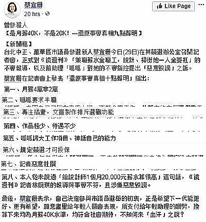 眼見勢(shì)頭不對(duì),蔡宜珊馬上在網(wǎng)上駁斥臺(tái)媒“報(bào)道不實(shí)”,并列出了10點(diǎn)聲明。具體的長(zhǎng)篇大論侃爺就不多贅述了,給各位把“知識(shí)點(diǎn)”梳理了一下,自行看圖解惑吧~總之大體內(nèi)容就是一句話:有“刁民”要阻礙我的議員選舉路!