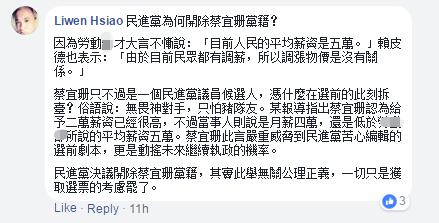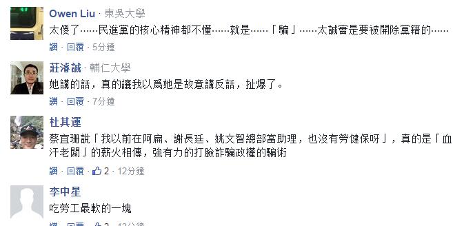 民進(jìn)黨臺(tái)北市議員擬參選人蔡宜珊日前被前助理控訴是“血汗老板”,但蔡回應(yīng)時(shí)竟說(shuō)“薪水2萬(wàn)(新臺(tái)幣,下同)算很高,沒虧欠助理”,此話一出立即引發(fā)了熱議;這還不算完,人家之后更爆猛料,“我以前在陳水扁、謝長(zhǎng)廷、姚文智總部當(dāng)助理,也沒有勞健保呀”,一句話就成功棒打三位綠營(yíng)大咖,被網(wǎng)友調(diào)侃是“民進(jìn)黨最強(qiáng)豬隊(duì)友”。