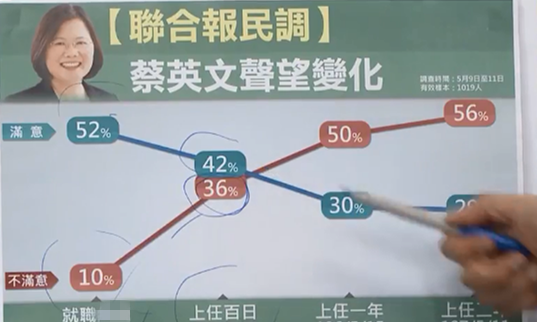 可以看到蔡英文剛剛就職的時候,滿意度高達52%哦,不滿意度只有10%,詐騙集團戰績超神。而上任百天后,情況開始急劇變化,滿意度下滑到四成,不滿意度上升到接近四成。也就是說,僅僅花了三個月的時間,臺灣民眾已經嘗出來,這盤菜不對味啊!