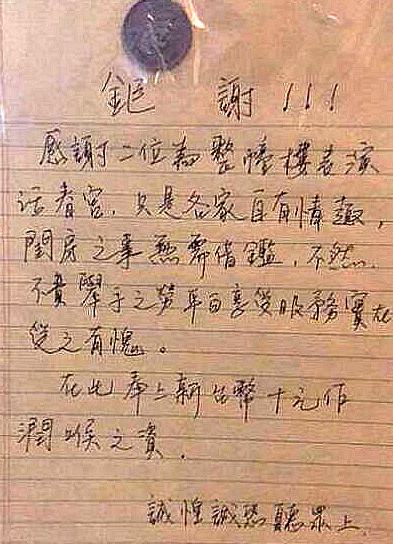 只見紙條上寫著:“巨謝!感謝二位為整棟樓表演活春宮,只是各家自有情趣,閨房之事無須借鑒,不然不費(fèi)舉手之勞平白享受服務(wù)實(shí)在受之有愧,在此奉上新臺(tái)幣10元作潤喉之資,誠惶誠恐聽眾上”,字里行間透露出被人擾了清夢的無奈。PO主也好笑地表示,一大早看到住戶的信箱貼了這個(gè),也是暈了,“半夜沒聽到聲音有點(diǎn)無言,會(huì)不會(huì)明天又貼一張變50嘞”。