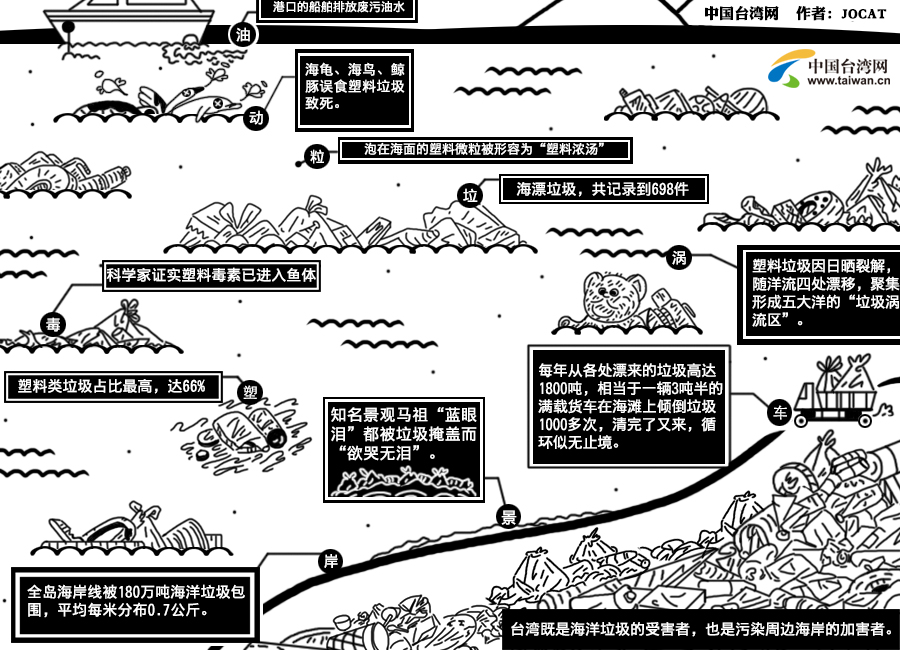 有島內學者形容,臺灣受大陸沿岸流、日本暖流和季風影響,被迫成為東亞與南亞海洋垃圾的攔截網,加上自己產出的垃圾,寶島已成了被垃圾包圍的島嶼。臺灣既是海洋垃圾的受害者,也是污染周邊海岸的加害者。(文字來源:人民日報海外版)