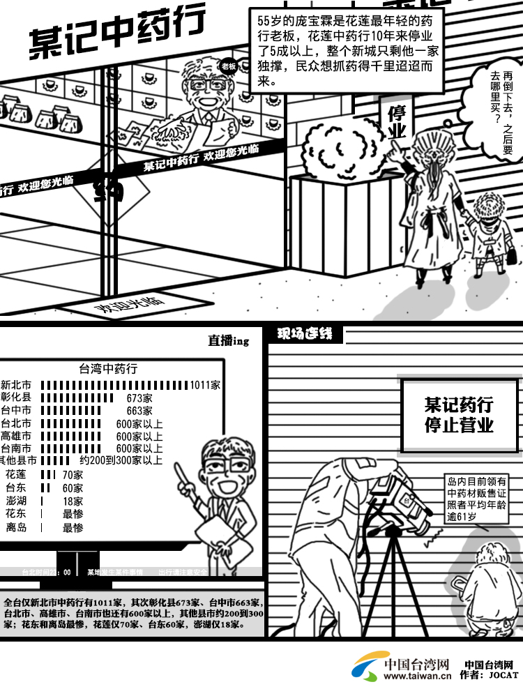 據臺灣《中國時報》報道指出,到中藥房抓帖養生補氣的藥方,是臺灣再平常不過的生活風景,但這傳統文化卻以每年300家的速度關門!臺當局“衛福部”1993年訂中藥商落日條款,25年來不培訓、不考試,沒再發過一張執業許可證,執業的老人家凋零,藥房就面臨關門命運。臺灣“中藥商業同業公會全臺聯合會”統計,2017年包含基隆、新竹、臺東、花蓮已不到100家,澎湖更剩不到20家。