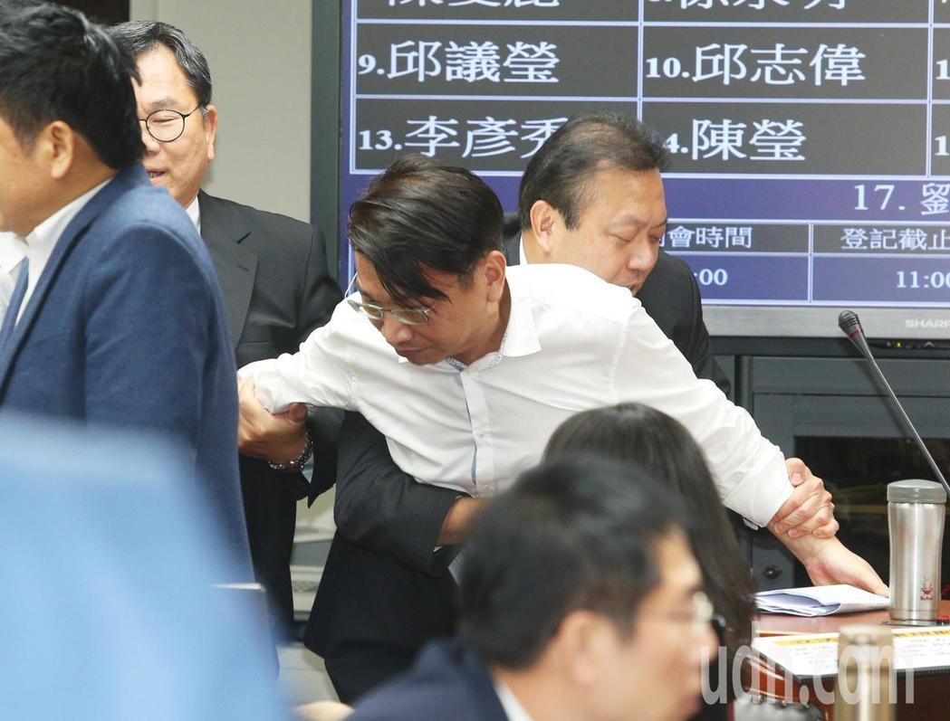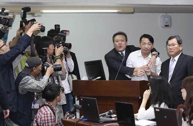 “時代力量立委”徐永明(右二)強占發(fā)言臺近11個小時后,在民進黨“立委”強力拉扯出“委員會”后,會議才可開始。(圖片來源:臺灣《聯(lián)合報》)