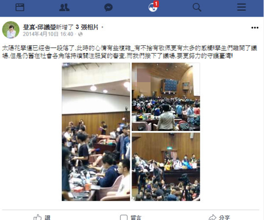 邱議瑩3年前為“太陽花”感性發(fā)文。(圖片取自臺媒)