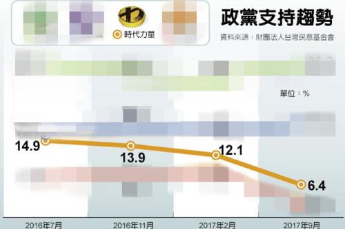 據(jù)《聯(lián)合報》今年9月份報道,親綠的臺灣民意基金會針對政黨進行支持度的調(diào)查,“時力”的支持度僅剩6.4%。基金會董事長游盈隆稱,“時力”流失原有支持度的57%,“這對一個新興的小黨可以說是一個非常嚴重的警訊,有邊緣化和泡沫化危機。”