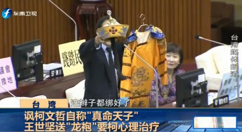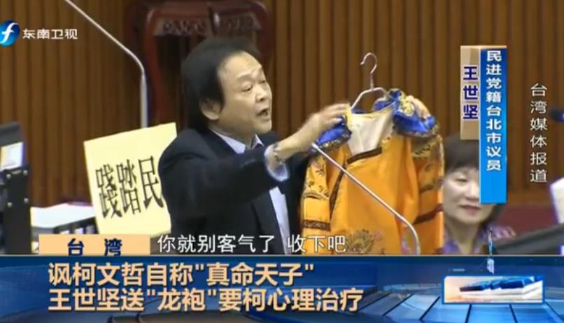 王世堅(jiān)與柯文哲互懟早不止一兩次,情緒激動(dòng)的王世堅(jiān)也是不斷鬧出笑話(huà)。據(jù)東南衛(wèi)視報(bào)道,柯文哲10日赴議會(huì)施政報(bào)告,王世堅(jiān)拿出“龍袍”“龍帽”,說(shuō)要送給自稱(chēng)“真命天子”的柯文哲,引起全場(chǎng)哄堂大笑。王世堅(jiān)說(shuō):“幫柯市長(zhǎng)準(zhǔn)備了一套‘龍袍’,讓柯市長(zhǎng)私下在辦公室或在家里可以穿上它過(guò)過(guò)癮,這也算是一種心理治療”。他還勸說(shuō)柯文哲,“送給自稱(chēng)‘真命天子’的你,你就別客氣了,收下吧。”