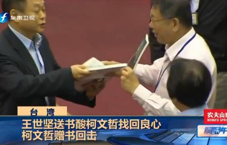 王世堅(jiān)與柯文哲互相贈(zèng)書(shū)。(圖片截取自東南衛(wèi)視視頻)