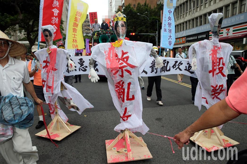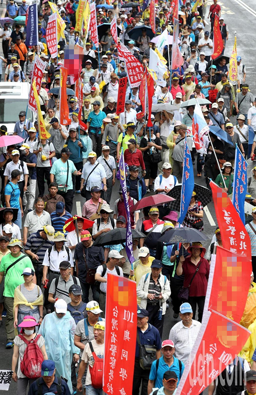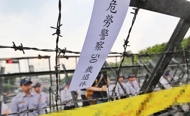 退休警消反年改團體,24日持續上街頭,在“立法院”中山南路周邊集結游行抗議。(圖片來源:臺灣《聯合報》)