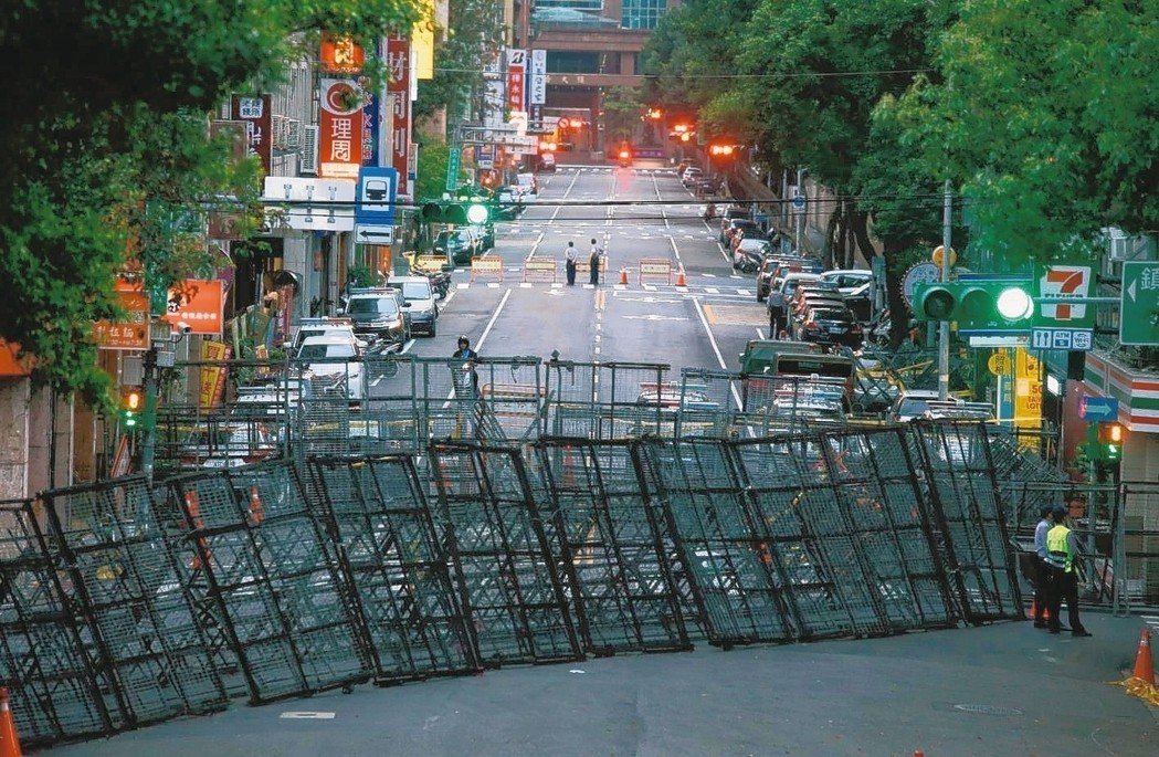 “立法院”外除了重重蛇籠外,警方還夜以繼日地在重要路口警戒。(圖片來源:臺灣《聯合報》)