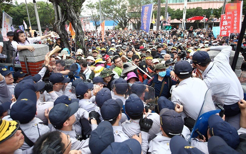 退休警消反年改團體,24日持續上街頭,在“立法院”中山南路周邊集結游行抗議。因不滿警方處理態度一度包圍中正一分局,雙方發生推擠。(圖片來源:臺灣《聯合報》)