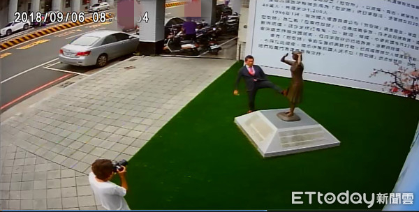 臺灣第一座慰安婦銅像8月14日在國民黨臺南市黨部揭幕,引發日本部分人士不滿。據臺灣“東森新聞云”報道,日本“慰安婦之真相國民運動組織”等16個團體,9月7日到國民黨臺南市黨部要求移除慰安婦銅像,其中團體代表藤井實彥疑用“腳踹”慰安婦銅像的粗暴動作遭監視器錄下。