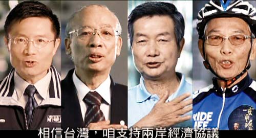 臺灣“傳產F4”代言ECFA。由右至左分別為劉金標、卓欽銘、王武雄及魏平祺。 來源:臺灣《聯合報》