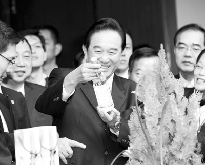 2月26日,陳云林參觀云林縣特產時,對名為“福祿壽”的白酒產生興趣。董會峰攝(中新社發)