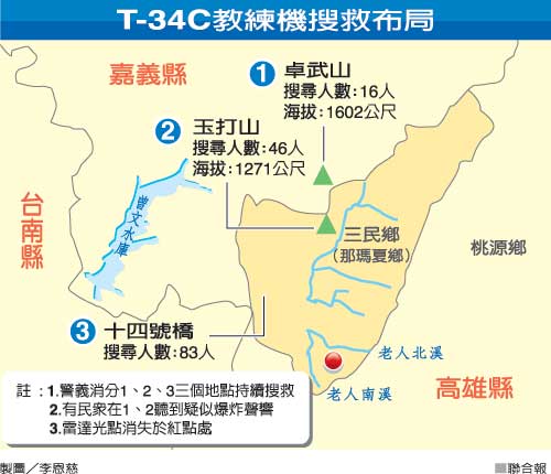 根據岡山空軍官校塔臺雷達光點位置,臺空軍分析教練機可能在高雄縣那瑪夏鄉山區出事,臺軍陸軍第八軍團和高雄縣政府消防局火速出動救難人員上山。昨日下午4時,由臺軍警及義消組成的搜救隊在高雄縣三民消防分隊集結。