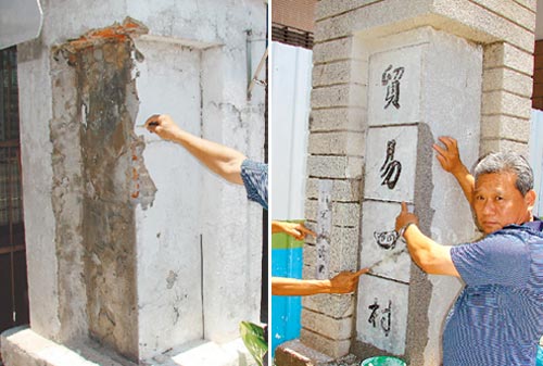 臺南縣二空新村改建,承包商日前將村門口宋美齡落款題字的石柱拆除(左圖),眷戶抗議并報警,承包商昨天將落款貼回,但裂痕清楚可見(右圖)。 來源:臺灣《聯(lián)合報》