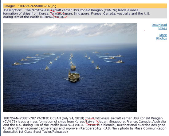 由美國主導的“環(huán)太平洋2010”軍演6月23日在夏威夷海疆進行,這個號稱世界最大規(guī)模的例行多國聯(lián)合演習由14個國家和地區(qū)參加,讓美國和其在該地區(qū)內(nèi)的盟國瘋狂的“炫耀”了一把武力。據(jù)臺灣媒體透漏,臺灣海軍的軍艦也參加了這次演戲,而且公布在了美國海軍的官方網(wǎng)站上。