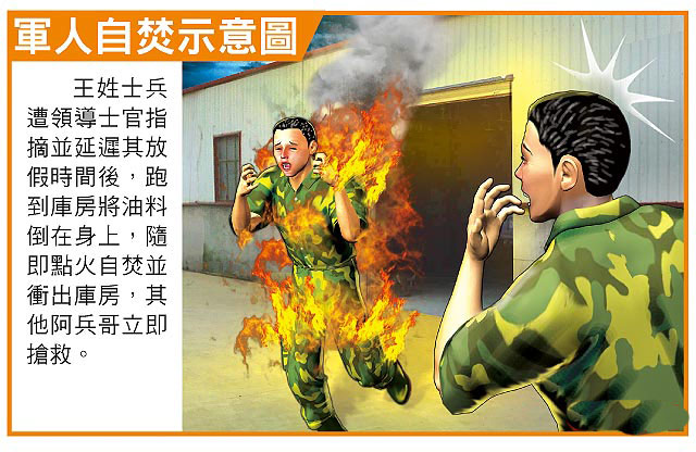臺軍一名王姓士兵因不滿領(lǐng)導要延后其放假,憤而澆汽油自焚。圖片來源:臺灣媒體