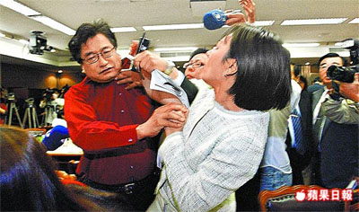 邱議瑩去年在臺灣“立法院”竟然打國民黨“立委”李慶華耳光,引起島內輿論一片嘩然,從此兇悍之名遠播。來源:臺灣《蘋果日報》