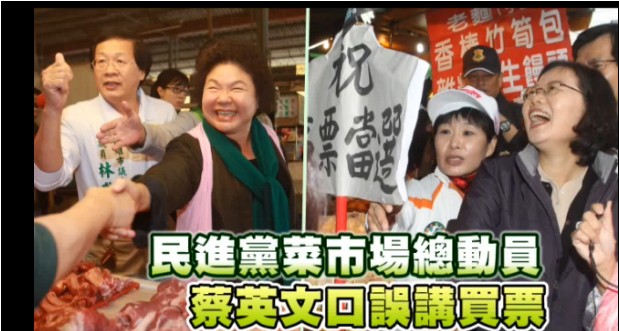 報(bào)道稱,民進(jìn)黨2012年臺灣地區(qū)領(lǐng)導(dǎo)人參選人蔡英文表示,將動員所有輔選力量,進(jìn)行全臺一千個菜市場掃街。不過,蔡致詞時,一度口誤把買菜說成“買票”,經(jīng)旁人提醒才更正,并略顯尷尬的干笑。(中國臺灣網(wǎng) 劉海偉)